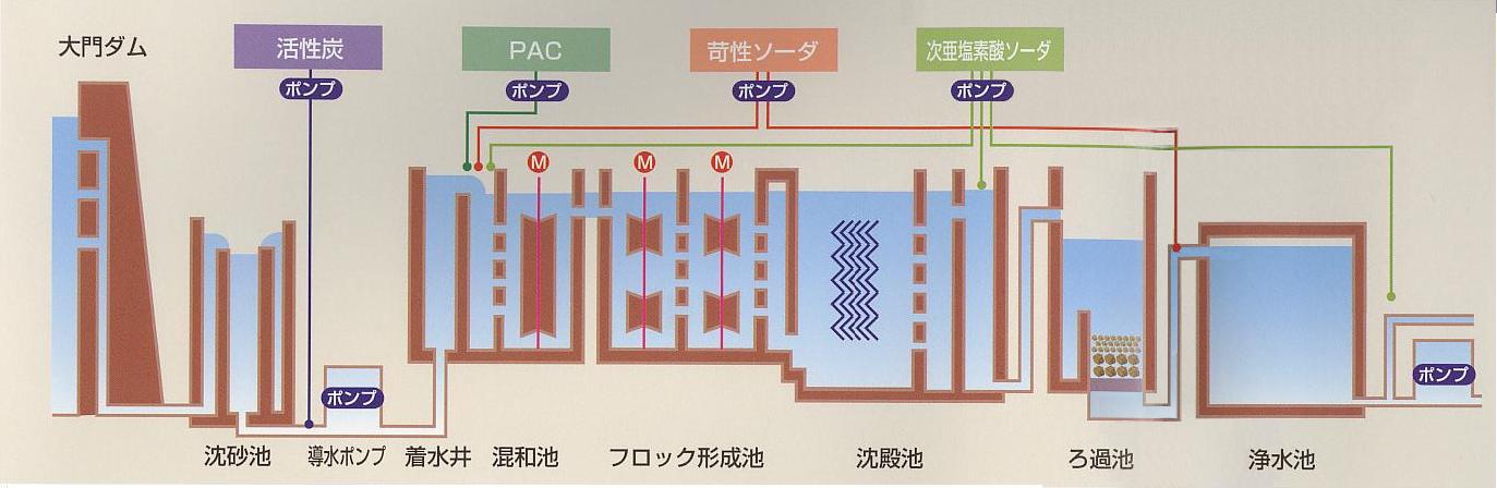 大門浄水場は、大門ダムからの水を取り入れ、この水をきれいな飲み水にして北杜市(高根町、長坂町、大泉町、小淵沢町)の配水池へ送っています。